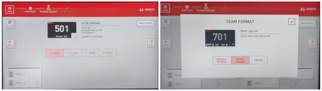 'TEAM FORMAT'은 3가지 옵션의 팀 구성 설정을 변경할 수 있습니다.