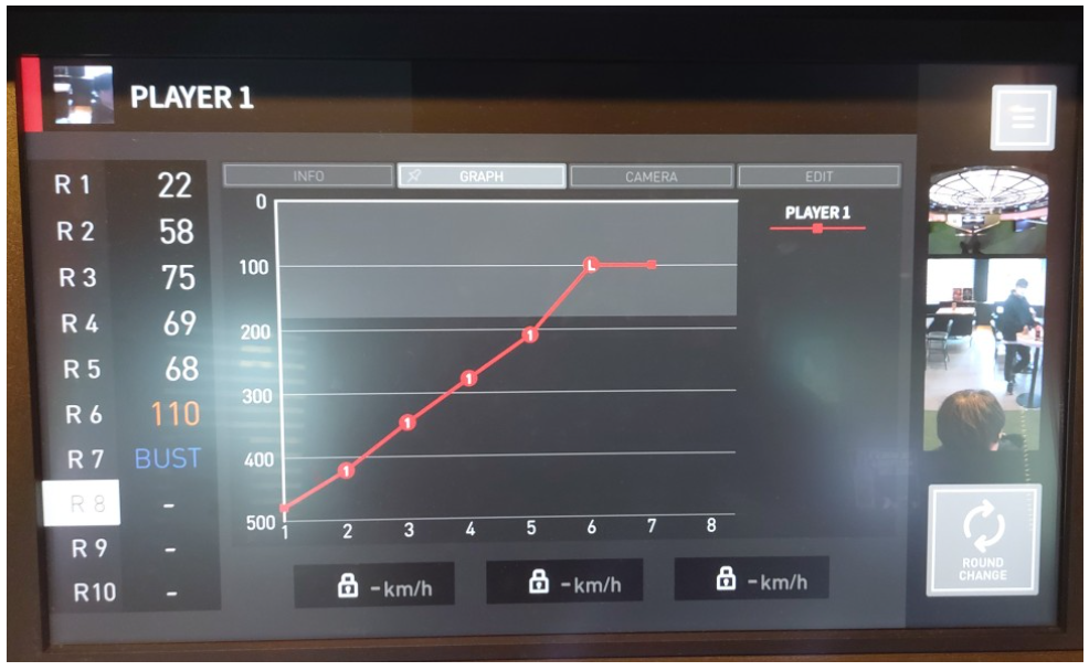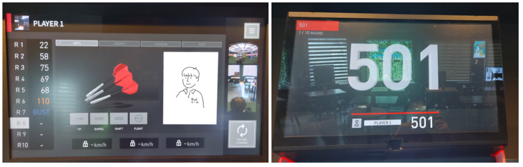 하단의 모니터에는 득점 점수, 플레이어의 기본 정보 및 배럴 세팅 값, 다트의 속도, 전면 카메라 및 보드 카메라 등