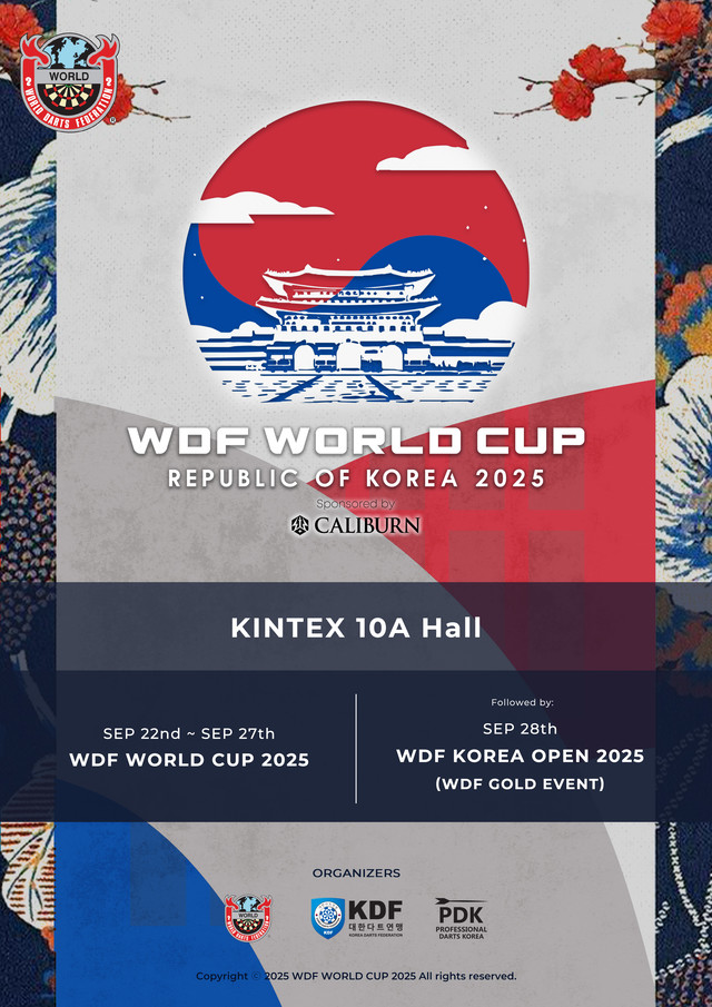 | WDF WORLD CUP REPUBLIC OF KOREA 2025 | 2025년 9월 22일 ~ 9월 27일 | 대회종료 | KINTEX 10A HALL | 대회결과 ➡ |