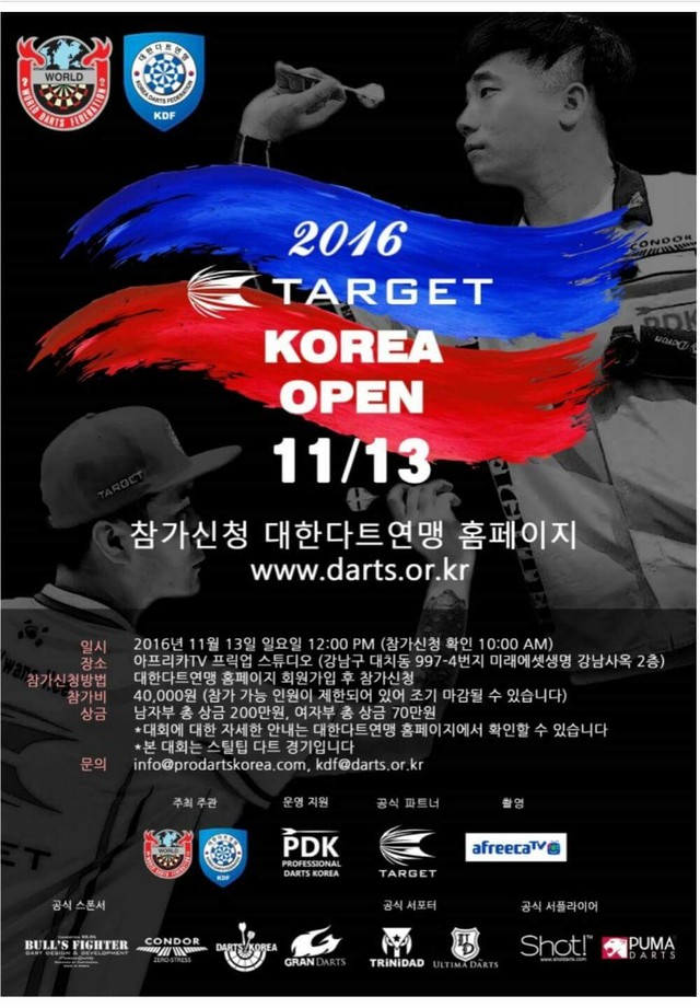 | WDF TARGET KOREA OPEN 2016 | 2016년 11월 13일 | 대회종료 | 아프리카TV | 대회결과 ➡ |