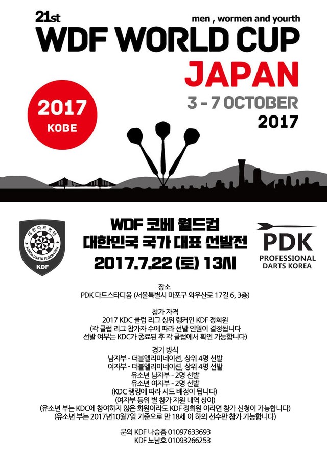 | WDF WORLD CUP JAPAN 2017 대한한국 대표 선발전 | 2017년 7월 22일 | 대회종료 | PDK DARTS STADIUM | 대회결과 ➡ |