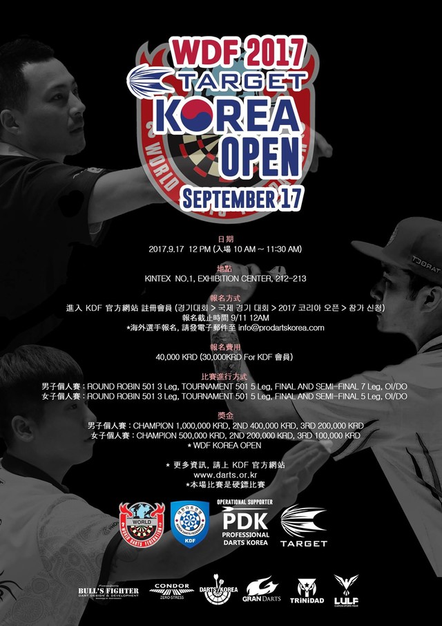 | WDF TARGET KOREA OPEN 2017 | 2017년 9월 17일 | 대회종료 | KINTEX 제1전시장 | 대회결과 ➡ |